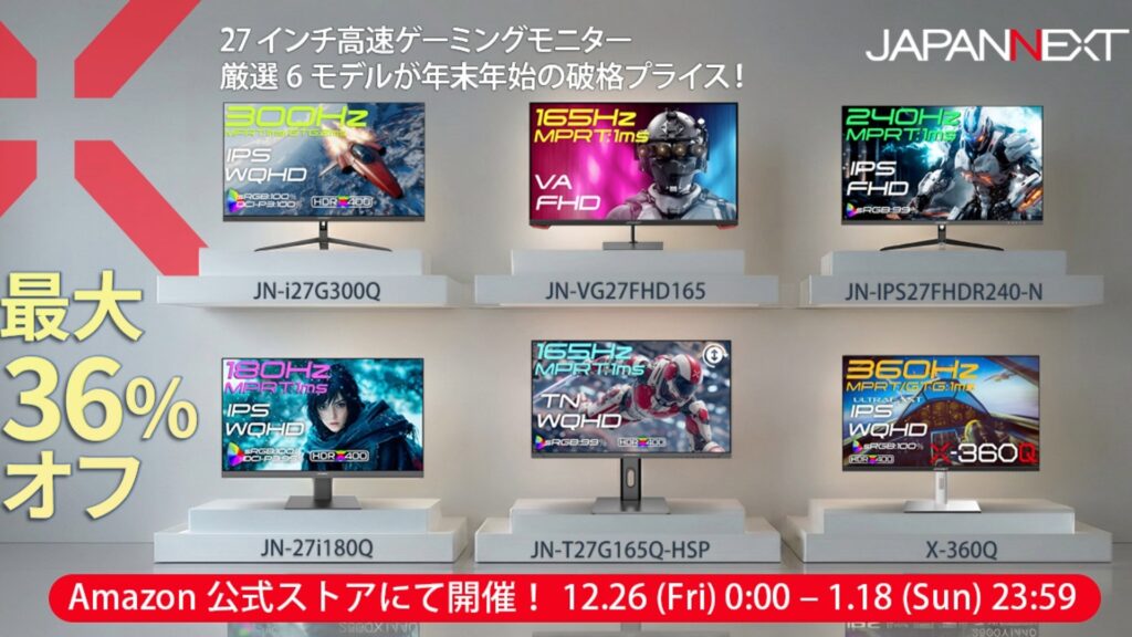 【JAPANNEXT】Amazon年末年始セール開催!2025年12月26日から、最大36%OFF