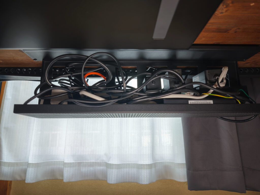 デスクの裏にケーブルトレーを設置するのが効果的だ。PCやモニターなど様々なデバイスを使うと、必然的にコンセントの数が必要になる。それらを別々のコンセントに挿すよりは、デスク下に配置した電源タップに集約させた方がいい。ケーブルのマネジメントも容易になる。