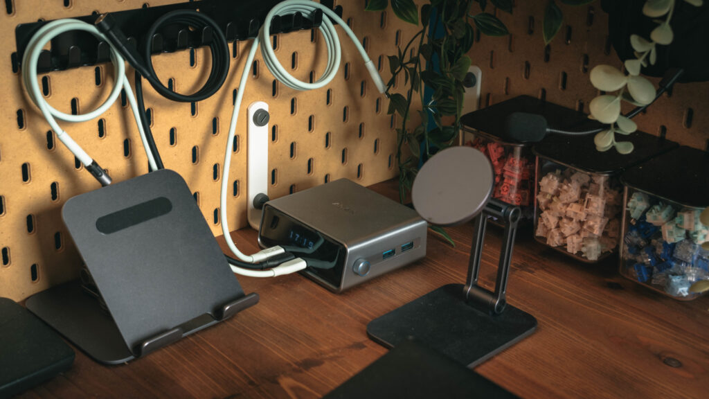 それに電動昇降デスクを使っているので、立ち作業に切り替えることも可能。また充電器を置いて充電ステーション的な役割にもしている。かゆいところに手が届くと言えるようなデスクだろう。
