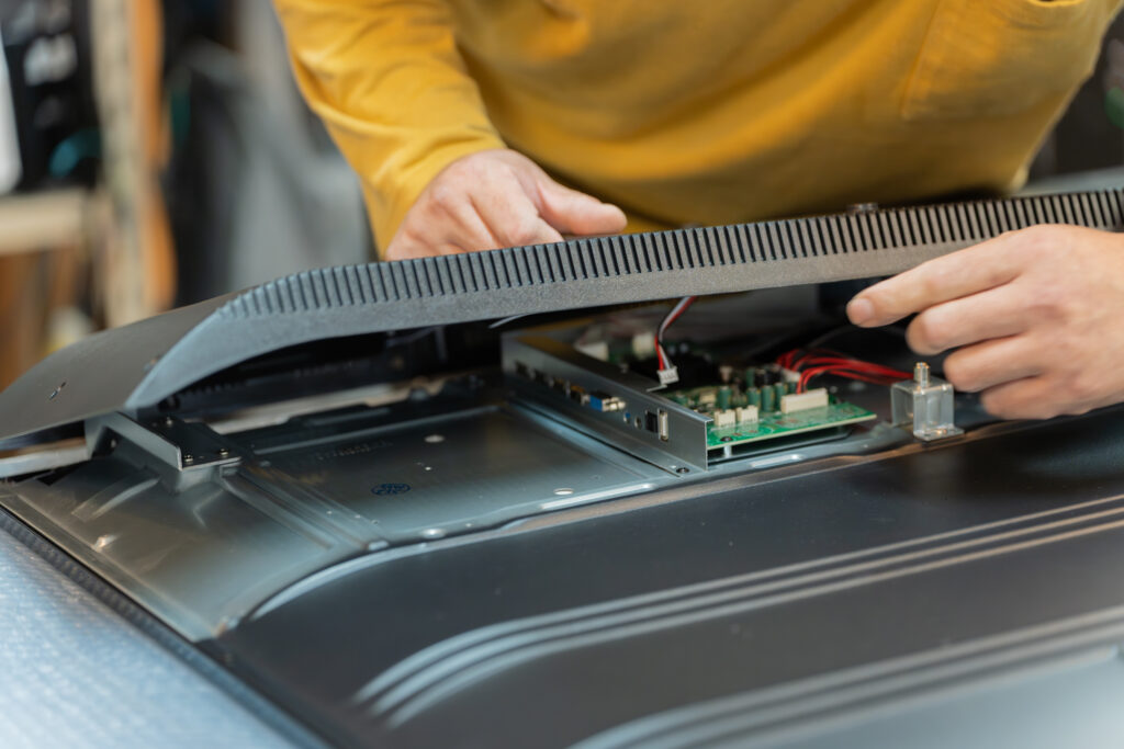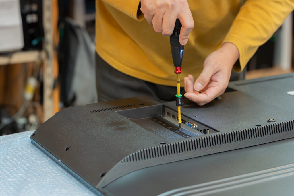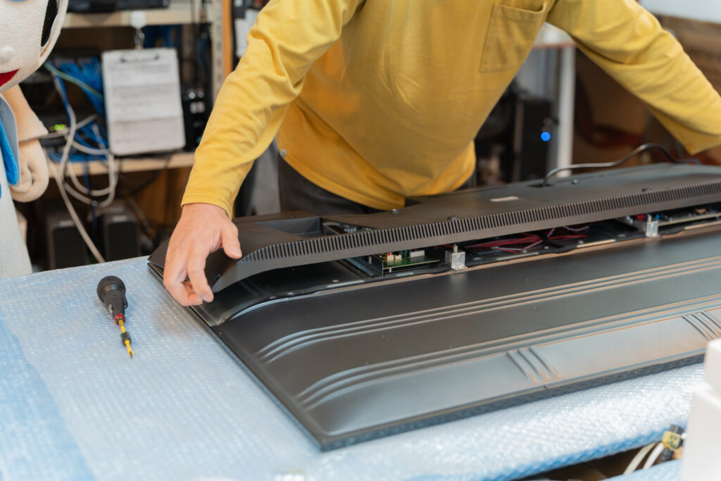 上の写真のように、画面の左下が暗くなってしまっているモニターを修理していくのだが、とにかくスピードが速い。かなり慣れた製品なのか、マニュアル等を確認せずともサクサク分解が進む。