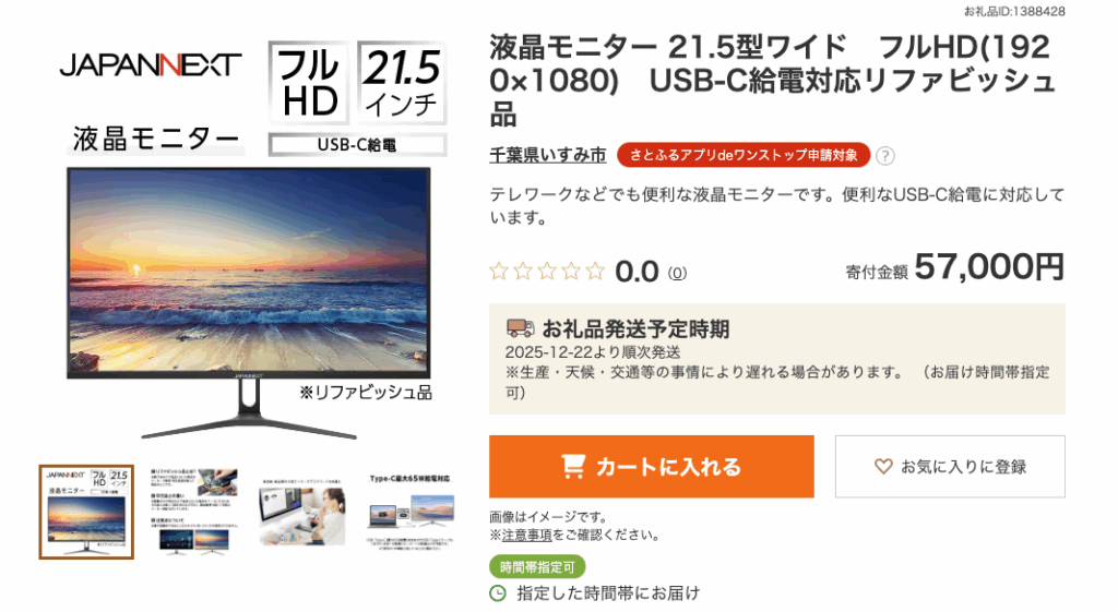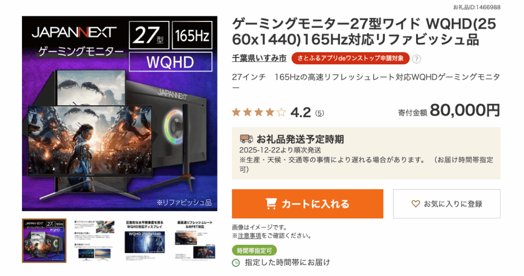 確かに大手ふるさと納税サイトを見てみると、5万円程度からType-C対応モニターなどを見つけることができた。通常こうしたモニター製品はかなり高額な寄付額が設定されている事が多いのだが、この価格帯であれば十分庶民でも検討できるレベル。また話題に上がった27インチWQHDのゲーミングモニターも8万円と、ふるさと納税の返礼品としては破格の寄付金額だ。