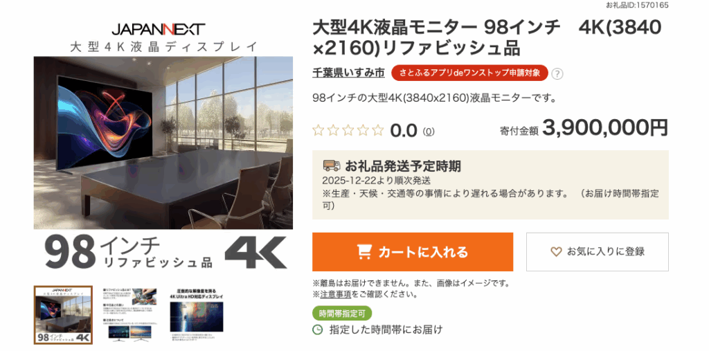 その一方で、JAPANNEXTの大型モニターと言えばな98インチは、なんと脅威の390万円。一体どんな方ならこれを返礼品に選べるのだろうか…