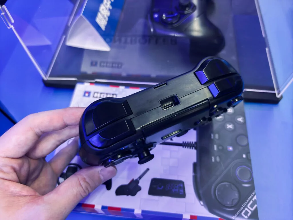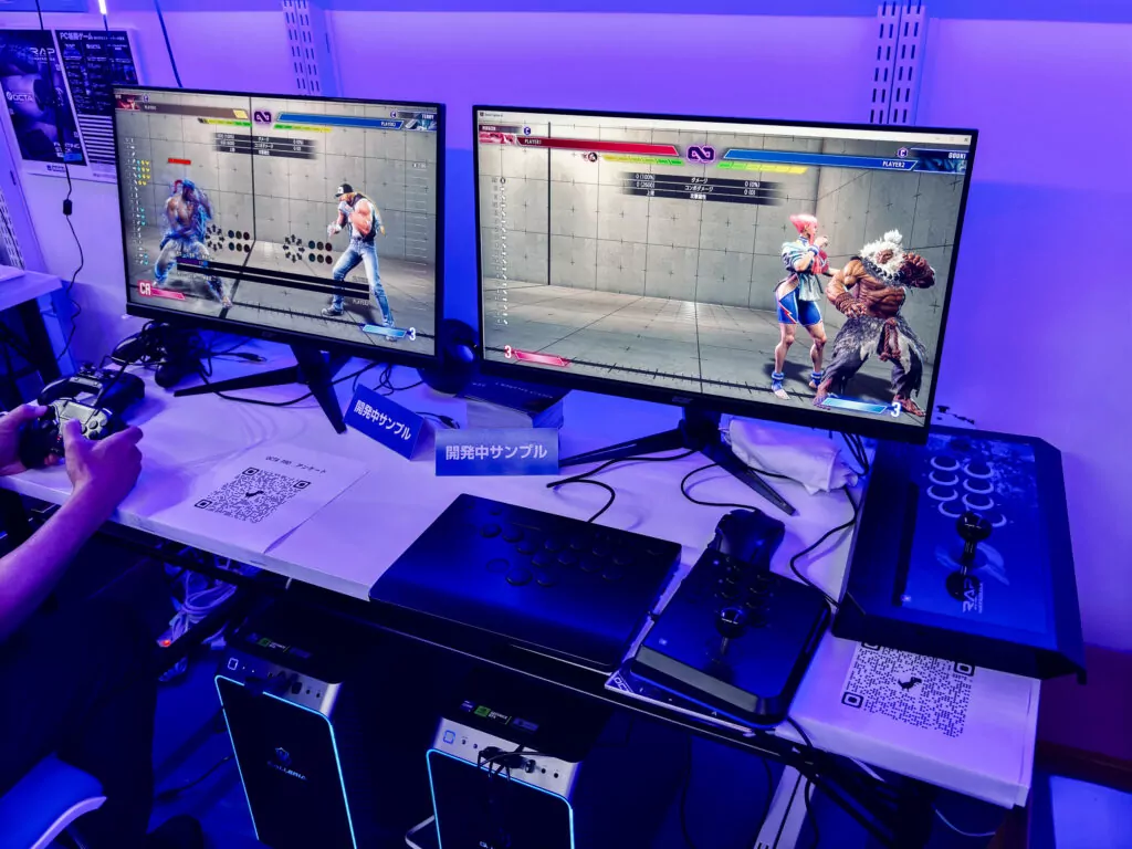 実機はストリートファイター6を遊びつつ触れるので、試しに触れてみた。まず押し心地は軽めで、押したときの音はあまり聞こえなかった。おそらく静音仕様になっているのかもしれないが、会場では他の音がうるさいので分かりづらい。とはいえメカニカルスイッチを付けているようなので、自分で外して他のキースイッチにも変えられるとのこと。静音性の高いキースイッチにすれば打鍵音も気にならなくなるだろう。