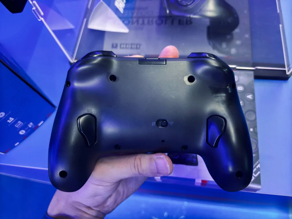 また薄っすらと丸くなっている箇所があるが、そこにボタンを増設できる模様。昨今のレバーレスコントローラーはボタンカスタマイズが主流となりつつあるので、HORIの製品でもそれができるのは嬉しい。いずれにせよまだ開発中なので、公式の発表が出るまで楽しみだ。
