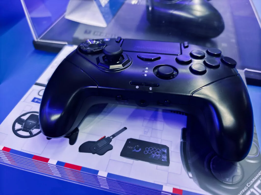 ブースのど真ん中に開発中の新製品が並んである。ショーケースの中にあるのが新作レバーレスコントローラーだ。その横にはファイティングコマンダーの新作も置いてある。