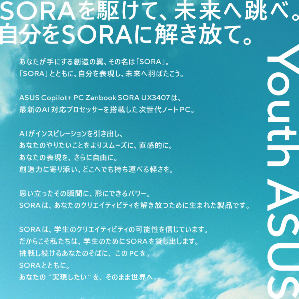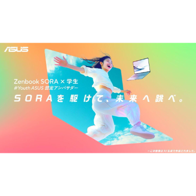 本キャンペーンはコンセプトに冠されているように、今年発売されたばかりの新世代AI PC「ASUS Zenbook SORA UX3407シリーズ」軸にしている。製品を提供された学生は「ASUS Zenbook SORA UX3407シリーズ」を通して日々の創作活動や自己表現、社会課題解決へのチャレンジを自身のSNS(X、Instagram、TikTok、YouTubeのいずれか)で発信し、ASUS JAPANがそれらの取り組みを製品の提供やイベントといった様々なアプローチで後押しするとのこと。