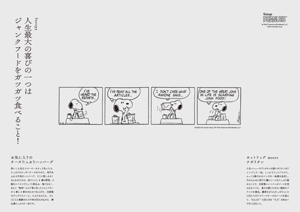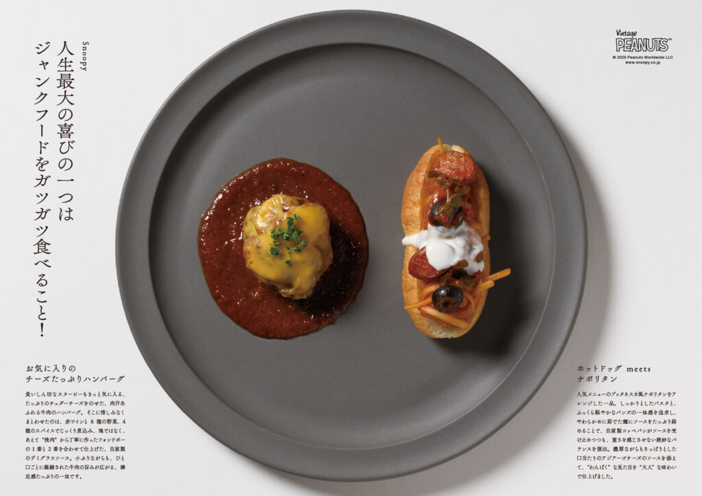 「ちょっと少ない、だから良い」という “1/2 (Nibun no Ichi)” のコンセプトはそのままに、オムライスやハンバーグ、ハヤシライスなど、定番の洋食メニューがPEANUTSの世界観と融合し、アメリカンテイストの特別なアレンジで提供されるという。