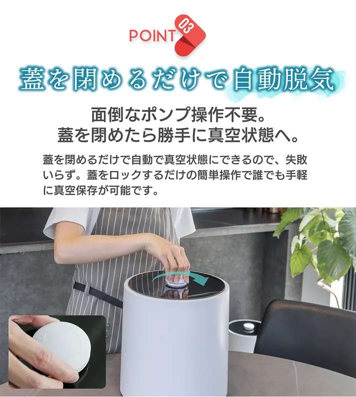 気圧感知バルブを内蔵した蓋構造により、誰でも簡単に真空保存が可能になっている。キッチンでの調理中や片付け中など、忙しい時でも手間をかけずに食品の鮮度を保って保存可能だ。
