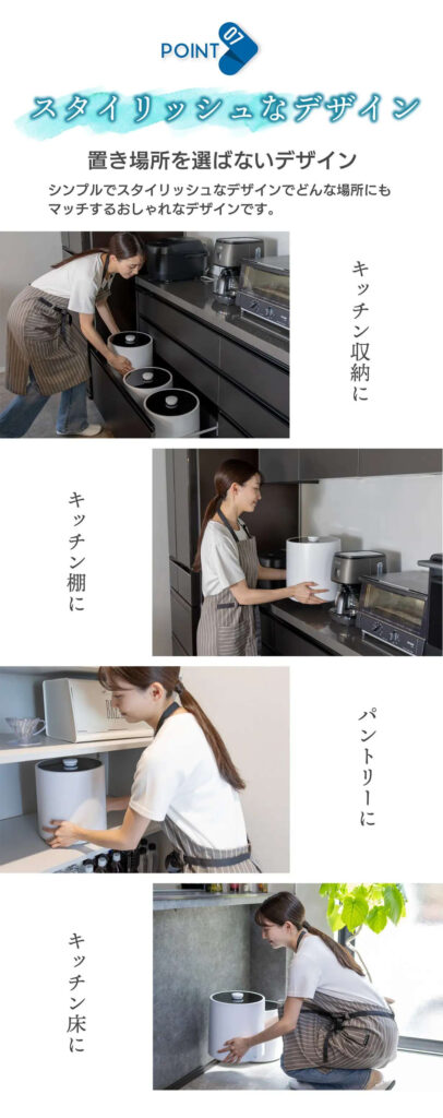 また、片手でも開閉できる蓋構造とスリムな円筒形デザインにより、キッチンでの使い勝手も抜群。限られたスペースでも収納しやすく、見た目もスタイリッシュなので、インテリアとしても映えるのではないだろうか。