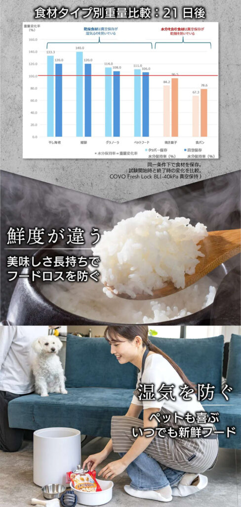 キッチンのストックやまとめ買いした食材をひとつの容器で管理できるため、収納スペースの節約にもなる。特にペットフードは開封後の酸化が早く風味が落ちやすいが、COVO Fresh Lockなら開けたてに近い状態でご飯をあげられる。