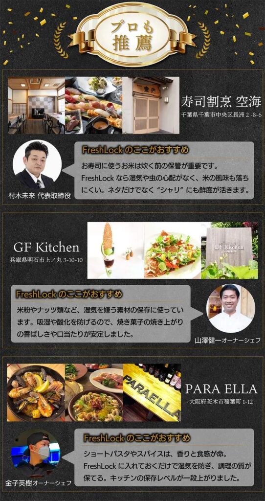 COVO Fresh Lockは一般家庭だけでなく、「食品のプロもおすすめする真空容器」として紹介されている。その性能は、食材の鮮度と品質にこだわるプロフェッショナルからも評価されているようだ。