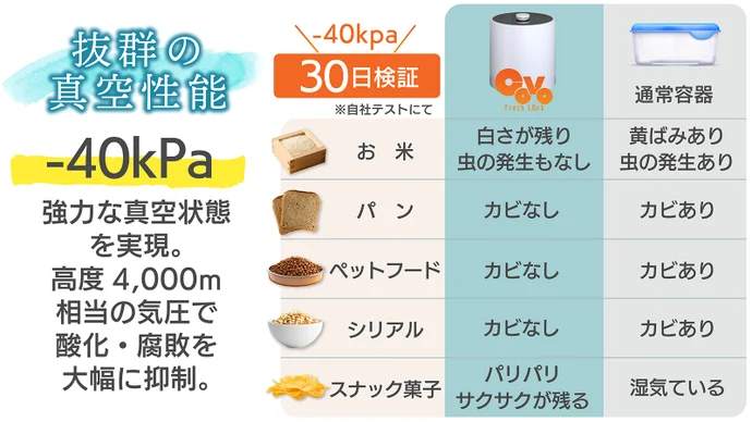 COVO Fresh Lockの特徴は、8Lクラスの容量を持ちつつ-40kPaという強力な脱気性能を持っている点だ。これは高度約4,000mに相当する気圧で、容器内の空気を減らす(酸素量を減少させる)ことにより、食品の酸化や腐敗を効果的に抑制するという。