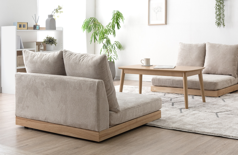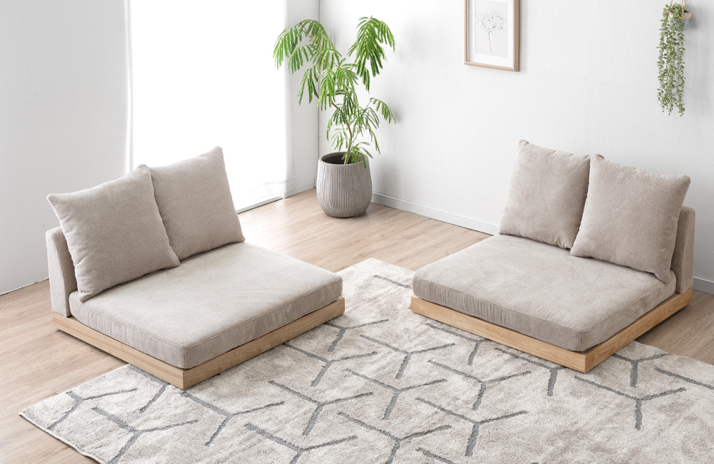 このソファは肘掛けのないアームレスデザインを採用しており、様々なレイアウトが可能となっている。2個セットと3個セットの販売を行っているため、部屋の広さや用途に応じて好みの組み合わせを選ぶといいだろう。