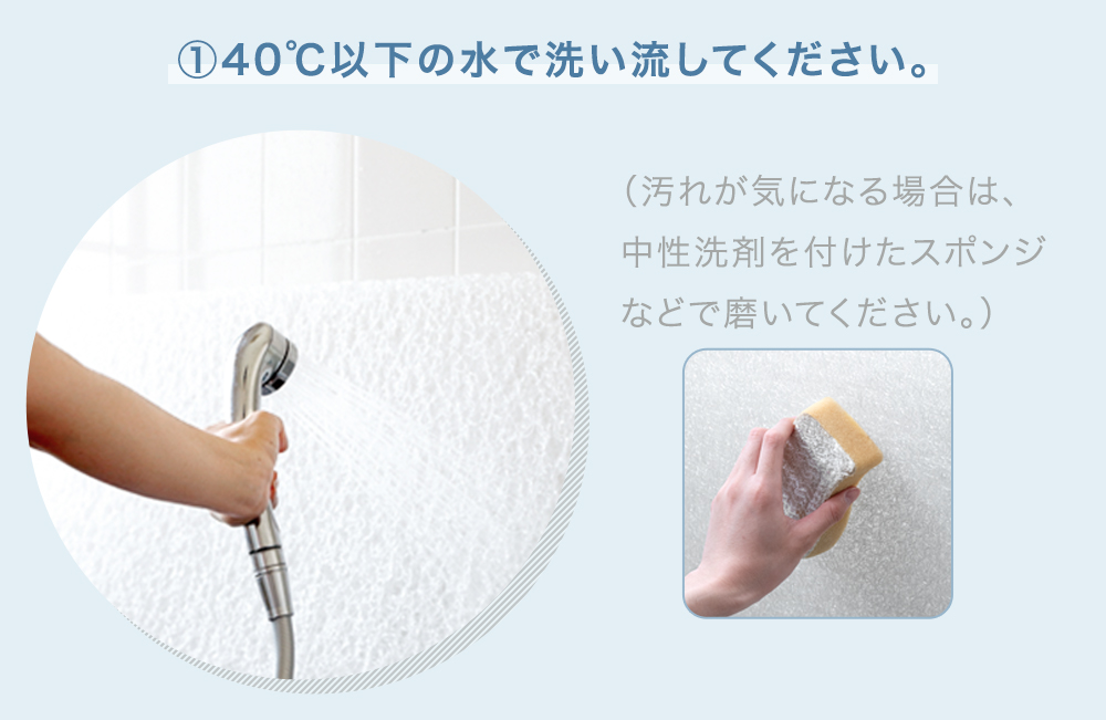 1.カバーを外した座面パーツを40℃以下のシャワーなどの水で洗い流す(汚れが気になる場合は中性洗剤を付けたスポンジで洗う)