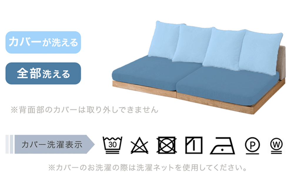 このソファのもう一つの特徴は、座面とクッションのカバーも取り外して洗濯ができる点だ。座面内部・座面カバー・クッションカバーのすべてを洗うことで、肌に触れるほとんどの部分を清潔に保つことができる。