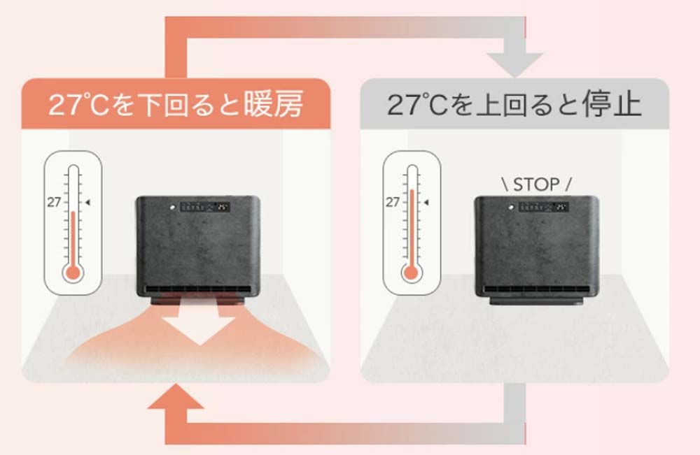また、室温センサーは、設定した温度(18℃~30℃の1℃刻み)に応じて自動運転を行う。例えば27℃に設定した場合、室温が27℃を下回ると運転を続け、上回ると停止。再び温度が下がると自動で運転を再開するため、常に快適な室温を保つことができる。