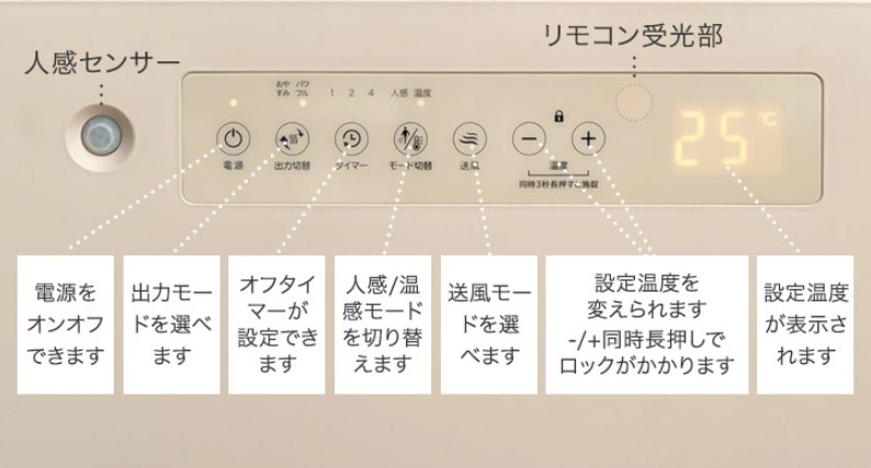 本製品最大の特徴は、人感センサーと室温センサーを組み合わせた「Wセンサー」機能。人感センサーは上下左右60度、距離2mの範囲内の人の動きを感知して自動運転を行い、約2分45秒間人の動きを感知しないと自動停止する。これにより消し忘れを防止し、効率的な暖房を実現しているとのこと。