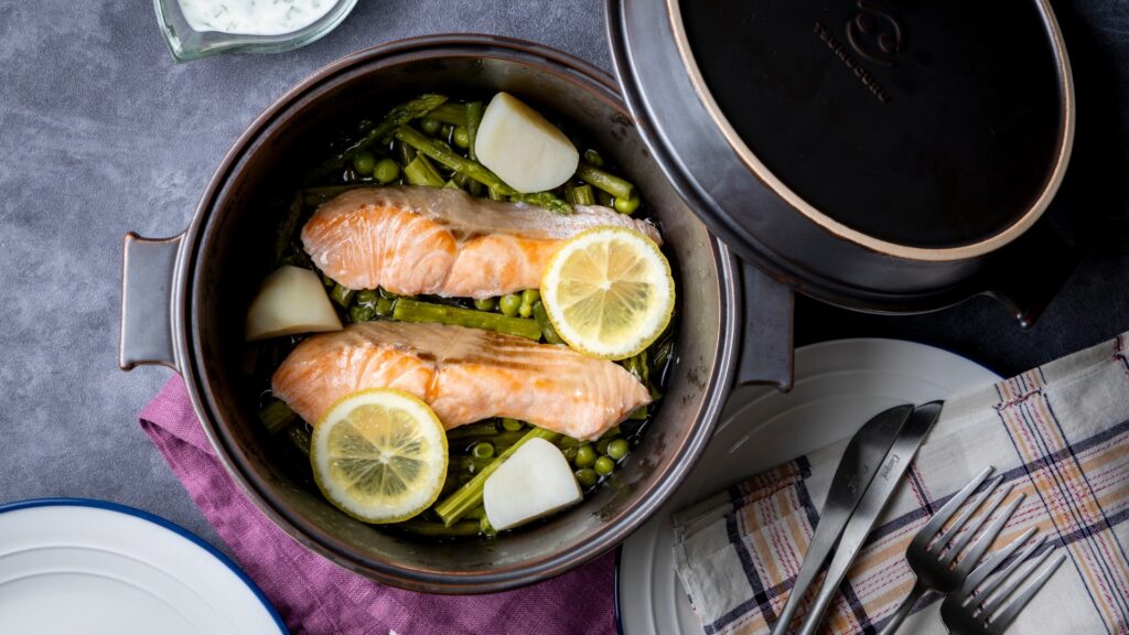 さらに、蓋に特殊な溝をつけることで素材から出る水蒸気が還元され、旨味や香りを閉じ込めた調理が可能。この構造により、誰でも簡単に「熱ウマふわトロ」な料理ができるという。