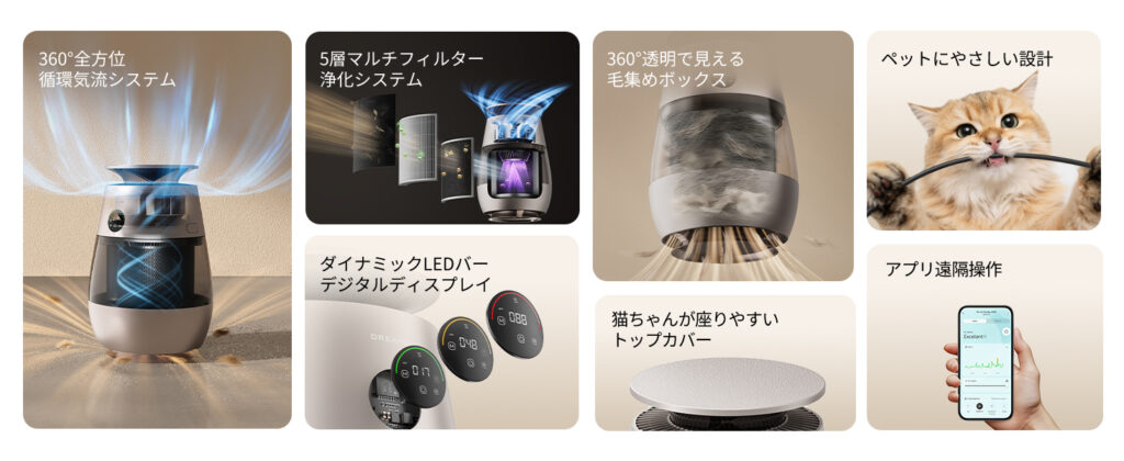 360度全方位吸引構造により、床面付近に溜まりやすい毛やホコリから空中に舞う浮遊毛まで対応するとしている。5層マルチフィルター浄化システムは、プレフィルター、高性能フィルター、活性炭フィルター、UVライト、多層構造フィルターで構成され、毛・ホコリ・花粉・ニオイに対応するそう。