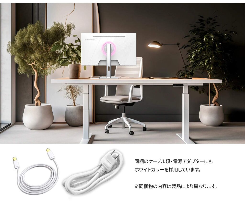 本体カラーにホワイトを採用する。モニターベゼルや付属ケーブルも白で統一しており、爽やかでおしゃれな空間やデバイスを白で揃えたい方に最適だとしている。スタンドにはシルバーカラーを採用し、白基調の中にさりげないアクセントを加える。