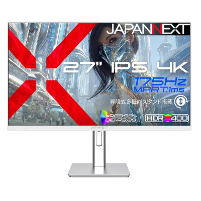 JAPANNEXTは2026年3月12日、27型ゲーミングモニター「JN-i27G175U-HSP-W」をAmazon限定で発売した。参考価格は5万980円(税込)。4K(3840×2160)解像度とリフレッシュレート175Hz、応答速度1ms(MPRT)を実現する。