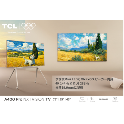 TCL JAPAN ELECTRONICSとカルチュア・コンビニエンス・クラブは2026年3月19日、壁掛けアートテレビ「TCL A400 Pro」のクラウドファンディングをGREEN FUNDINGで開始した。期間は2026年5月8日までで、43型5万9,800円、55型9万9,800円、75型15万9,800円から。発送開始は2026年6月下旬を予定する。
