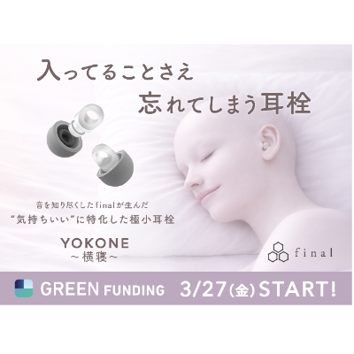 finalは2026年3月27日18時、極小耳栓「YOKONE 横寝」のクラウドファンディングをGREEN FUNDINGで開始した。音楽再生のために各帯域がバランス良く遮音することと快適な装着を目的にイヤーピースを設計・開発してきた長年の研究開発から生まれたという。
