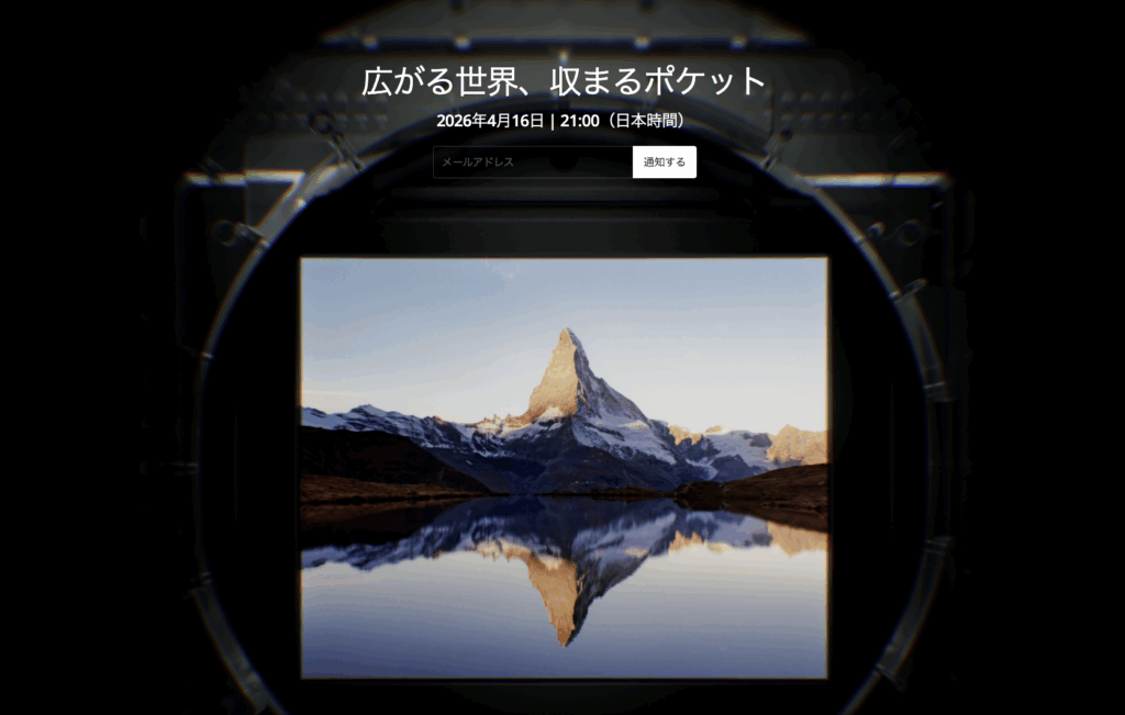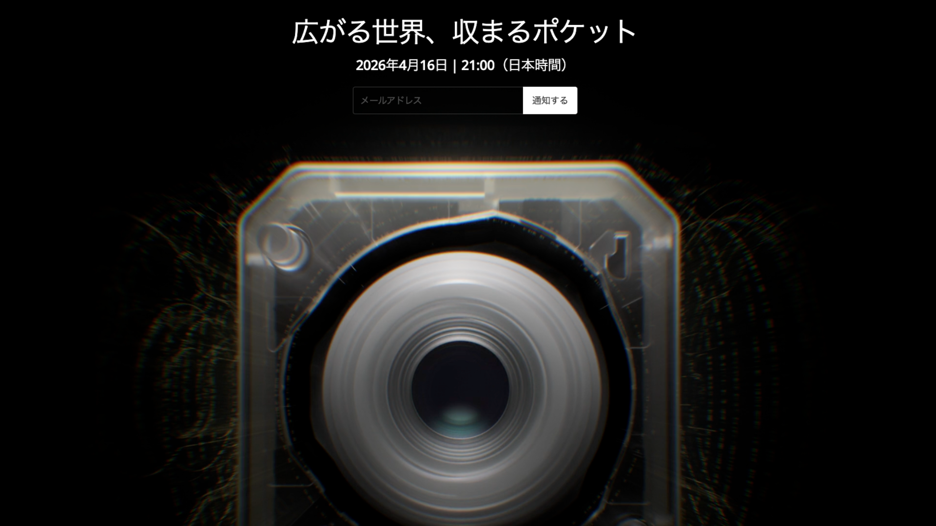 DJIは2026年4月9日、「Osmo Pocket 3」の後継機種と思われるジンバルカメラ「Osmo Pocket 4」のティザーサイトを公開した。正式発表は日本時間、2026年4月16日21:00とのこと。