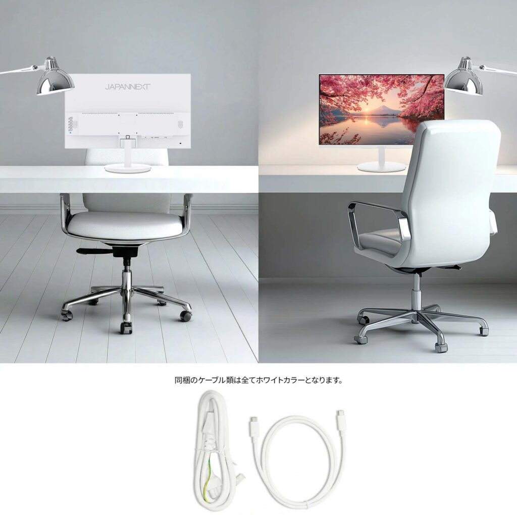 本体カラーにホワイトを採用。モニターベゼルやスタンドも白となっており爽やかでおしゃれな空間を演出したい場合やデバイスを白で統一したい場合に最適だとしている。付属のケーブル・電源アダプターにもホワイトカラーを採用しており、全体が白基調に統一された部屋や医療機関などでの使用にも最適だ。