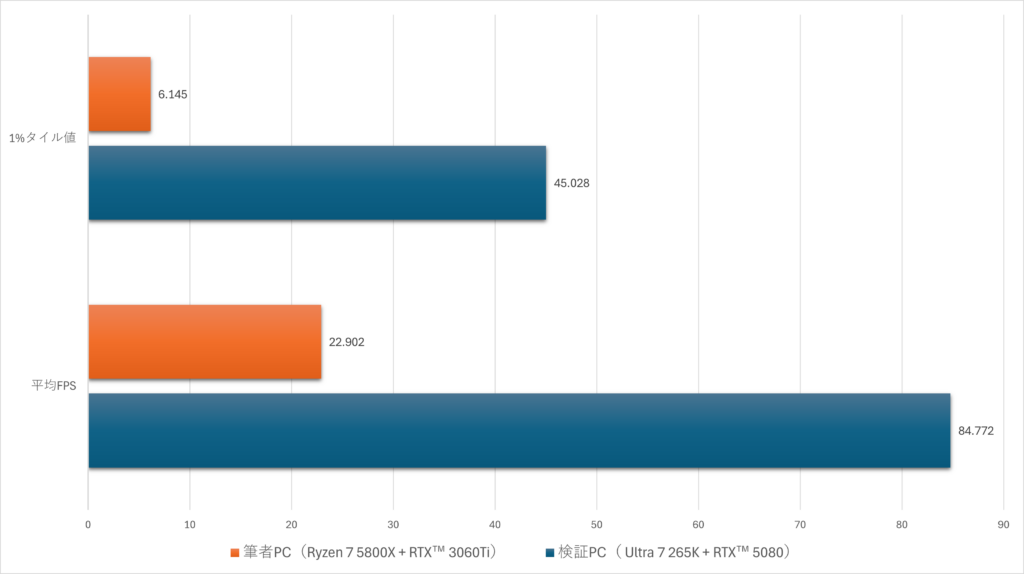 筆者のPCで無理やり4Kのウルトラ設定を動かした場合と比べるとその差は歴然で、平均FPSでザックリ4倍以上の性能だ。ちなみに下記のグラフ内に登場する1%タイル値というのは、計測時間中のフレームレートを下から順に並べた際の下位1%と上位99%の境目にあたる数値。簡単に言えばこの計測中、100秒のうち1秒はこの値を下回っていたことを示している。