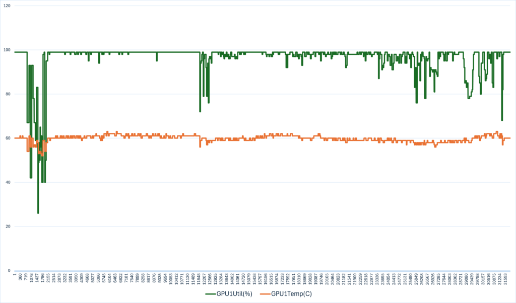 GeForce RTX™ 5080を搭載しているにも関わらず常に100%近く性能を必要とする点にも驚くが、注目すべきはオレンジのライン。なんとほぼ60℃付近で動いていない。