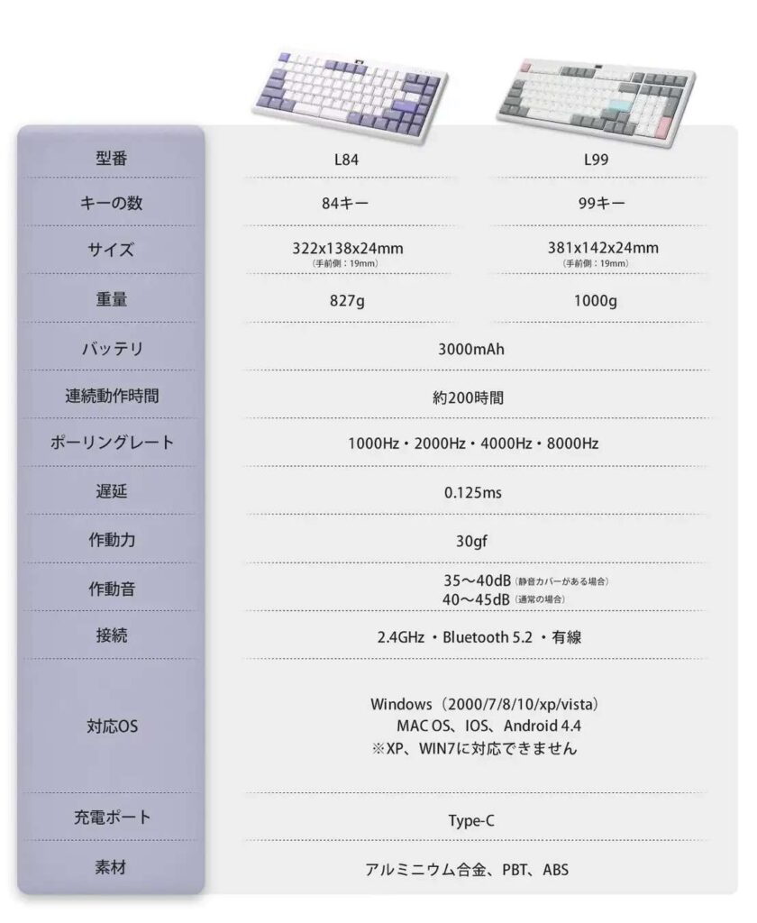 ちなみにL84はテンキーレス、L99はテンキー付きという違いがある。どちらを選んでも価格は同じらしい。