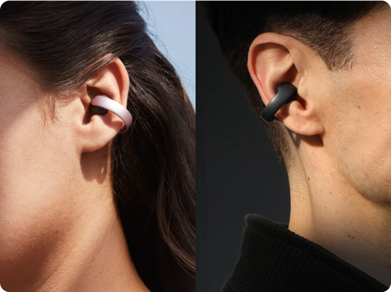 Soundcore AeroClipは、耳元を飾るアクセサリーのような洗練されたデザインが特徴だ。耳たぶを挟む形状のイヤーカフ型を採用しており、耳の穴に挿入する必要がない。そのため、メガネやサングラスと干渉しにくく、着脱も簡単に行える。またファッション性も考慮されており、シックなミッドナイトブラック、華やかなホワイト&ゴールド、柔らかい印象のピンク&ブラウンの3色をラインナップ。様々なファッションスタイルに合わせやすいデザインと言えるだろう。