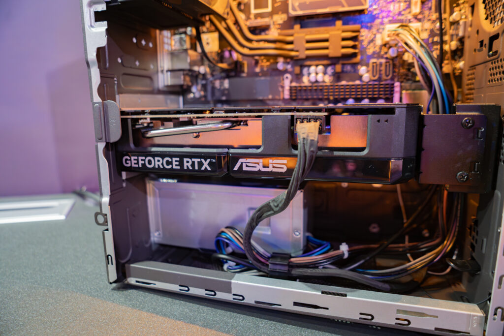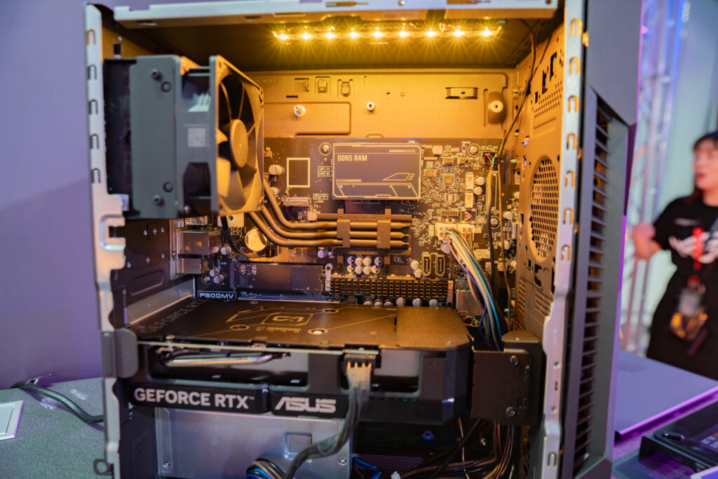 加えてCPUクーラーもヒートシンクを経由してケースに直結と中々豪快な構造で、ある種この辺りはとてもノートPCライクである。また形状やポートの配置を見るに、恐らくマザーボードは専用設計でATXなどの汎用規格では無さそうだ。この辺りもマザーボードを一から設計できるASUSだから実現できている部分だろう。