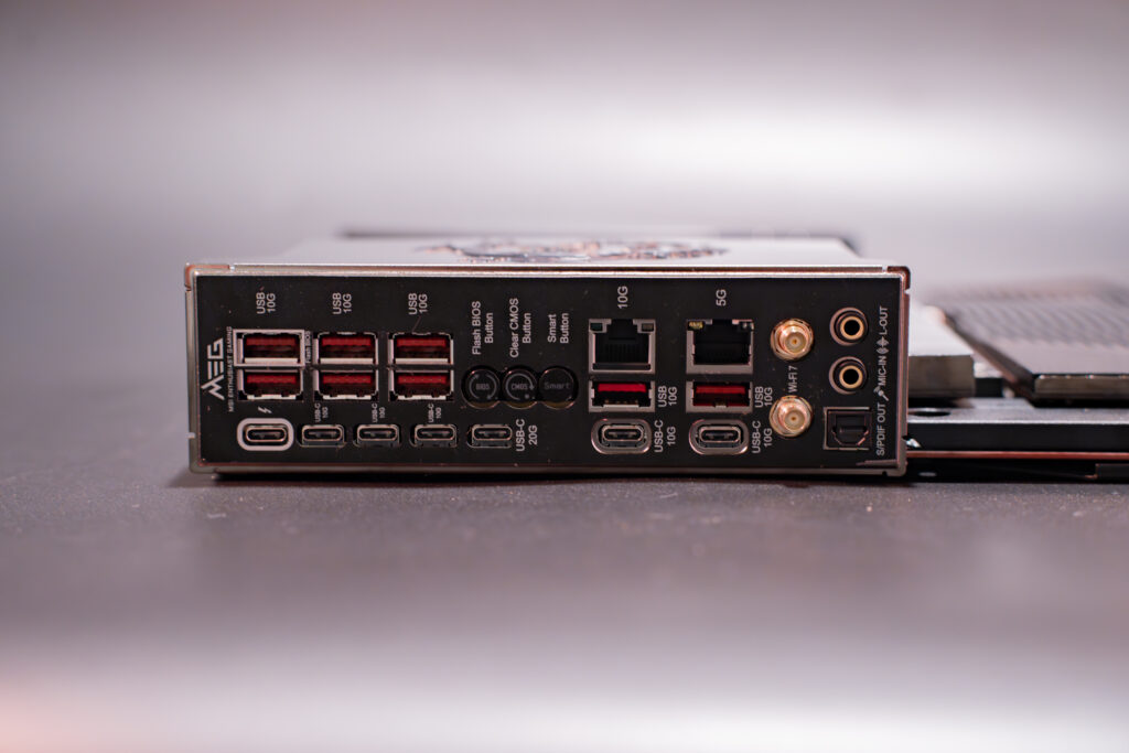 マザーボードに採用した「MEG Z890 GODLIKE」は、最新規格を全てフォローしている点が最大の持ち味だ。120Gbpsでのデータ転送に対応したThunderBolt 5ポート、理論上最大で5.6Gbpsでの無線通信が可能になるWi-Fi 7、10Gbps対応のLANポートなど、現在のマザーボードに組み込まれている最新規格は全て使用できる。