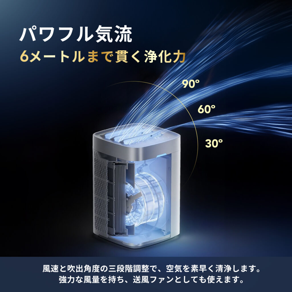 また3段階の角度と風量調整が可能で、用途や状況に合わせて最適な設定が選べる。さらに、6メートルのジェット気流を生み出す送風機能も備えており、暑い日には扇風機代わりにも活用できる実用性の高さも魅力だ。