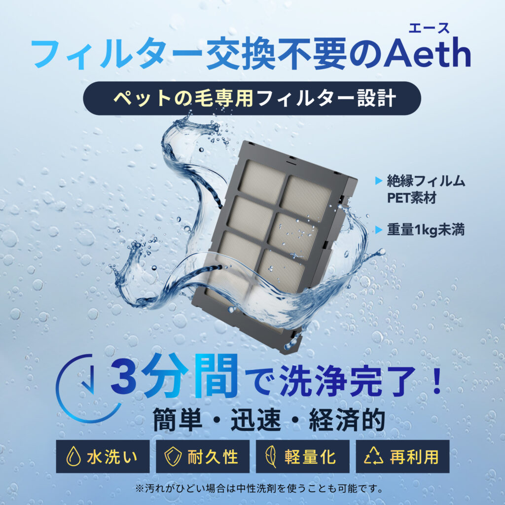空気清浄機の維持費とメンテナンスで大きな割合を占めるのがフィルター交換費用だが、Aethはこの悩みを解決してくれそう。近年世界的に注目される素材「グラフェン」を使用したフィルターを採用し、交換不要で水洗いだけでメンテナンス可能とのこと。