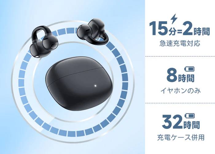 またバッテリー性能としては、1回の充電でイヤホン単体による最大8時間、充電ケースとの併用で最大32時間の音楽再生が可能。急速充電にも対応しており、約15分の急速充電でおよそ2時間の再生ができるため、急な外出前でも安心だ。