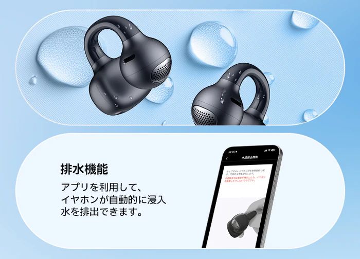 「Comfo Q」は通勤や仕事、家事など、あらゆるシーンで快適に音楽を楽しめるよう工夫されており、特徴の一つとして排水機能の搭載がある。専用アプリと連携することで、イヤホン内部に浸入した水分を自動的に素早く排出することが可能となっている。