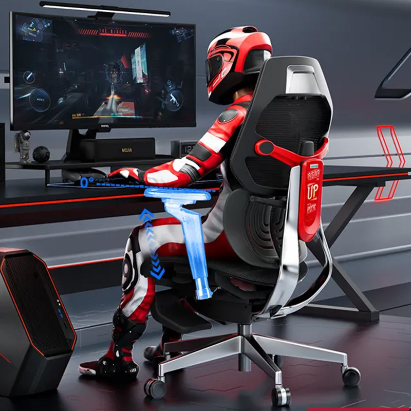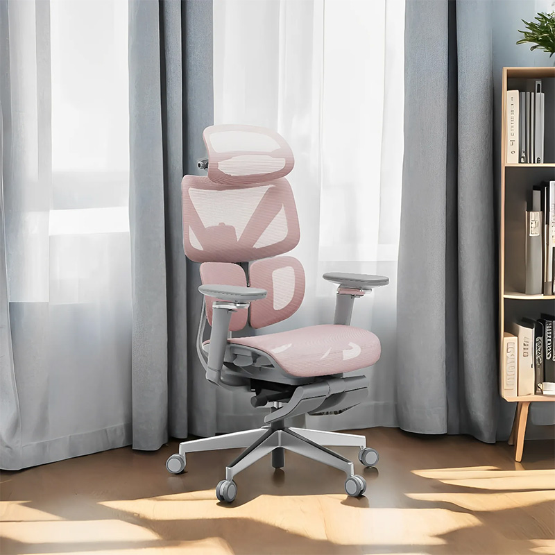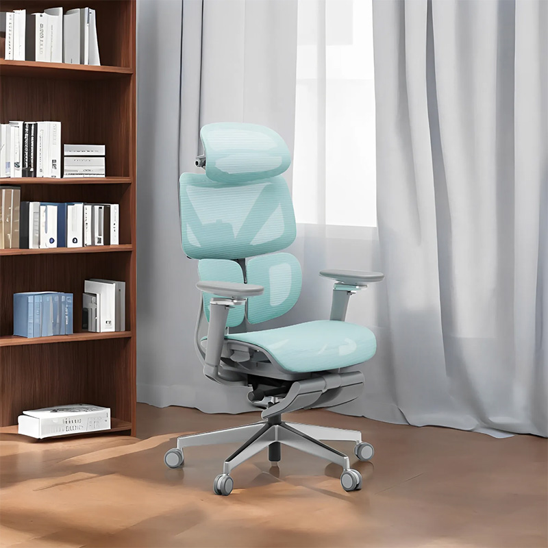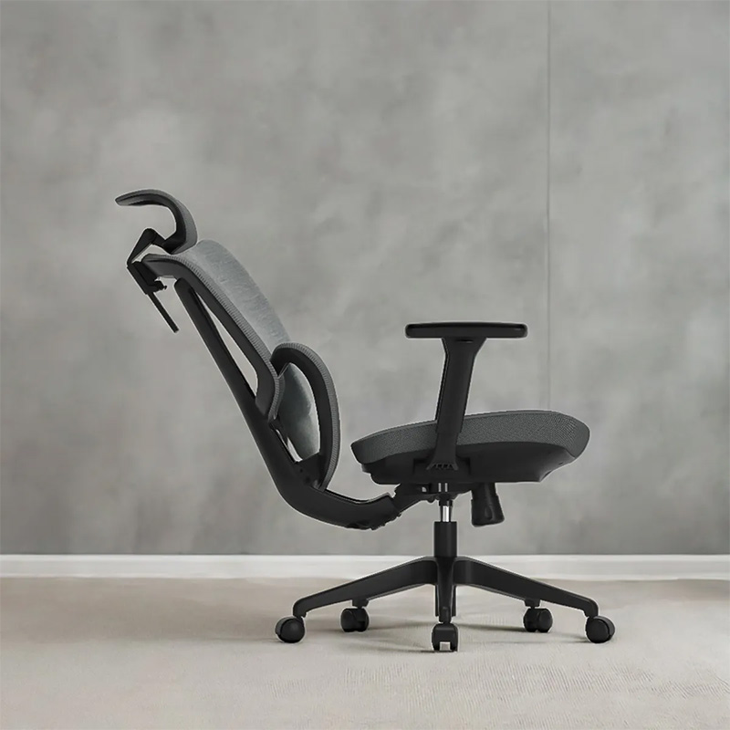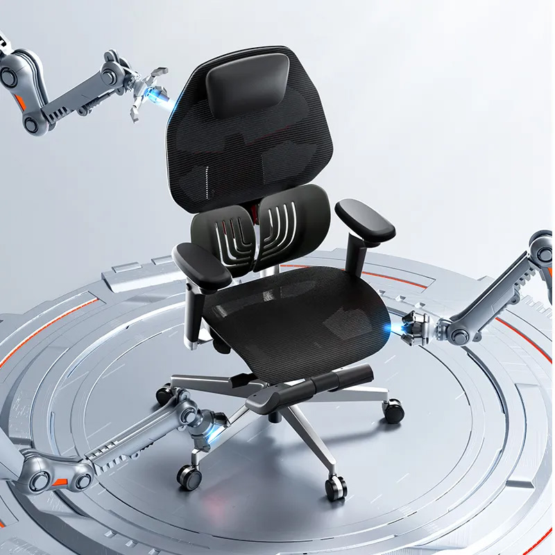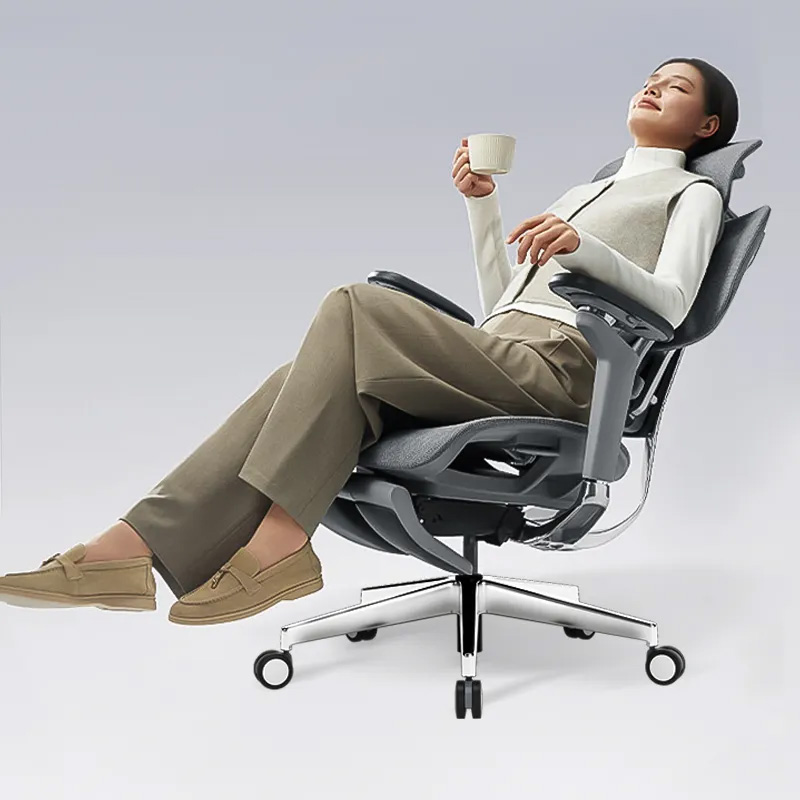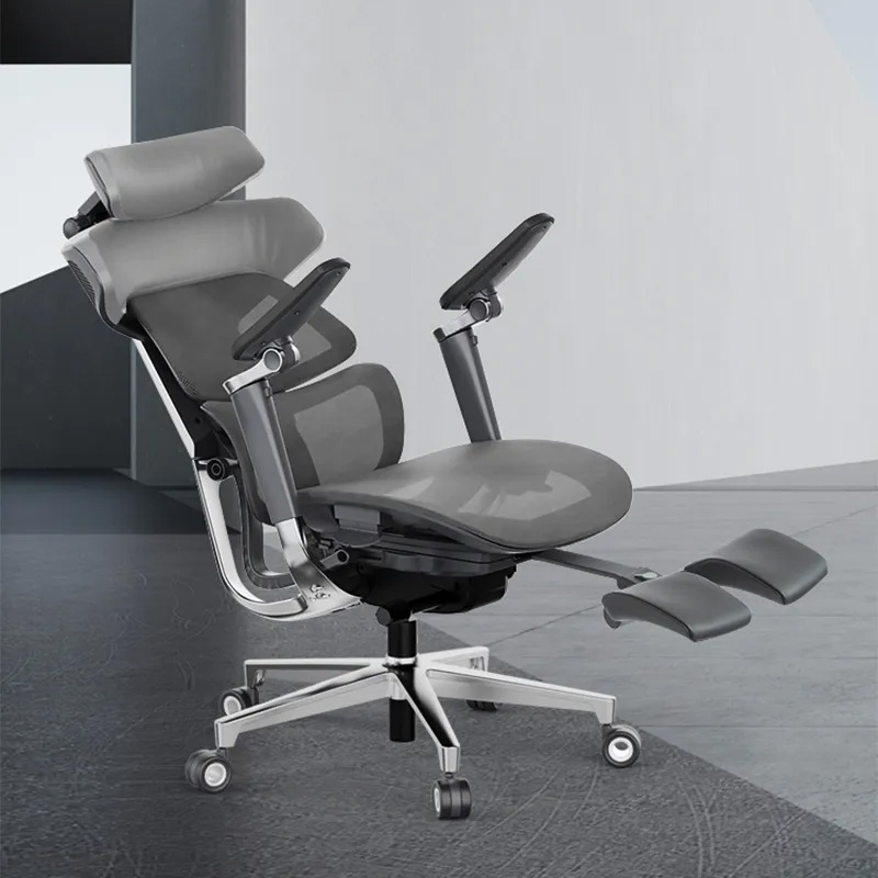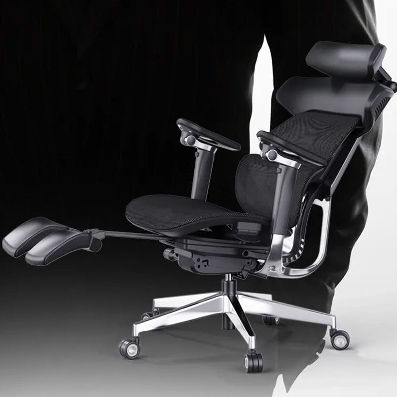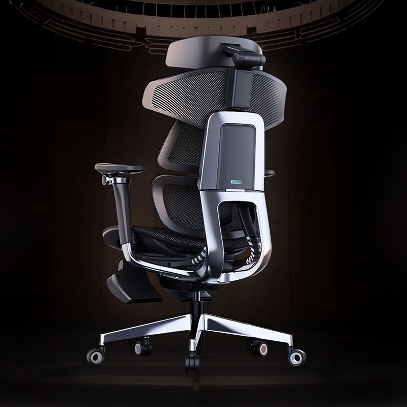 こちらは洗練された佇まいと快適性を兼ね備えた、高機能オフィスチェア。レザーとメッシュの異素材ミックスが上質な空間を演出し、6Dアームレストや多段階リクライニングで長時間の作業も快適にサポートする。