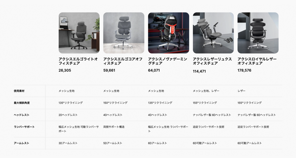 AXISUは、「Axis(軸)」と「Support(支え)」という概念をもとに開発されたシリーズ。美しいデザインと科学的アプローチにより、姿勢を正し、集中力を高めることで、働く人のパフォーマンスを最大限に引き出すことを目指しているとのこと。