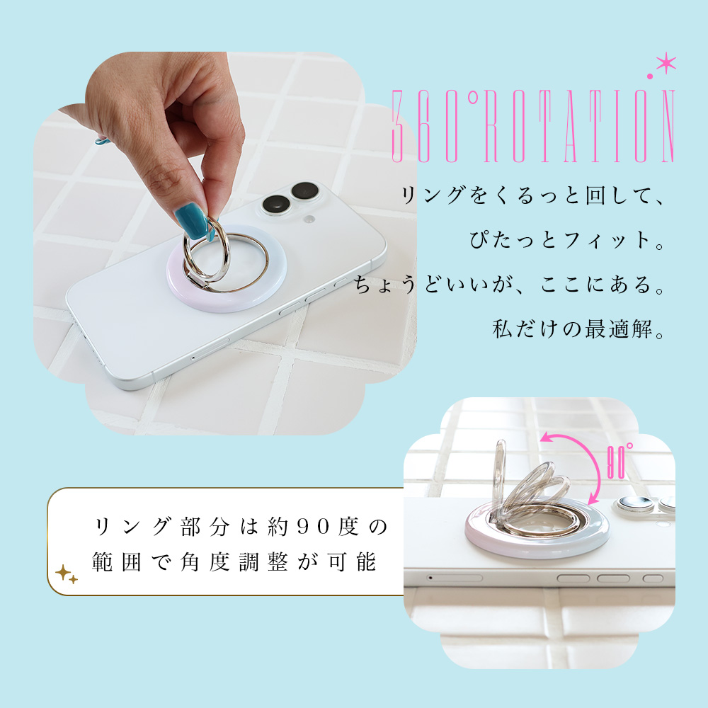 さらに、付属のメタルリングステッカーを使えば、Magsafe非対応のスマホやケースでも使用可能。iPhone以外のユーザーも、このオシャレなスマホリングを装着できる。