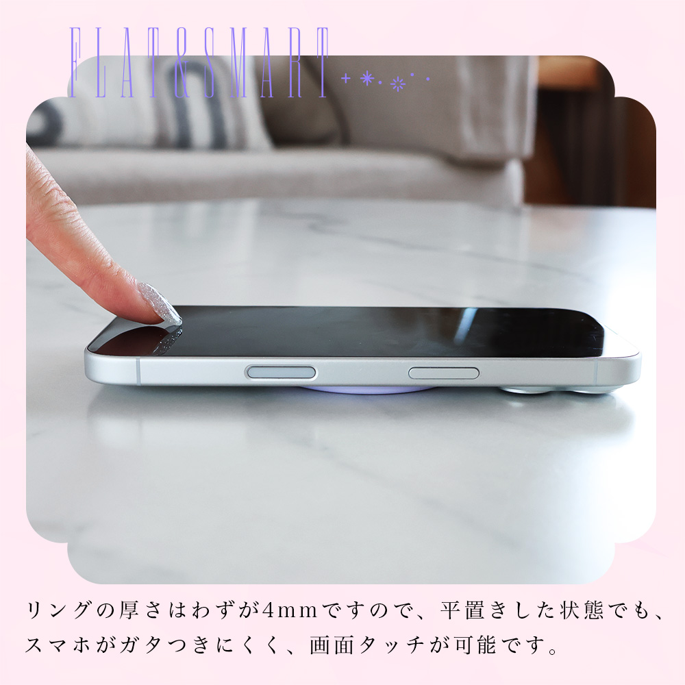 リングの厚さは4mmほどと薄い設計となっているので、スマホを平置きしても比較的安定して置くことができるとのこと。ポケットやカバンへも気軽に入れることができそうだ。