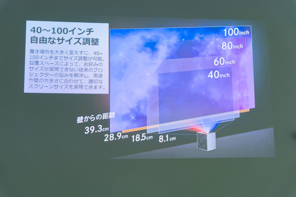 わずか8cmの距離で40インチ、40cmで100インチ投影の超短焦点