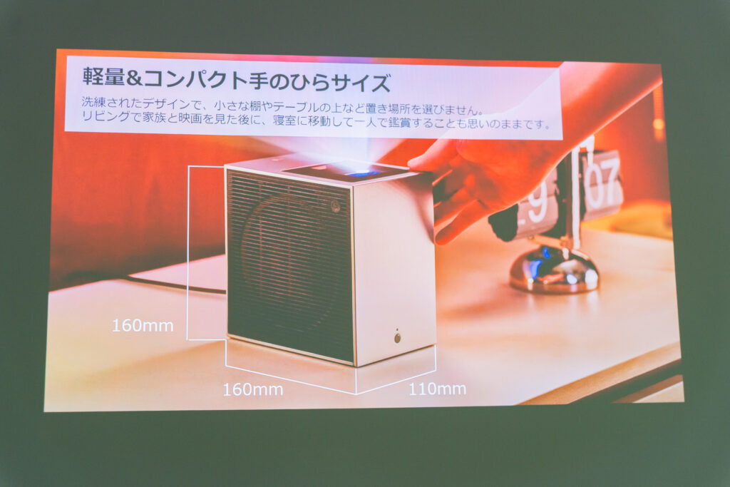 サイズはわずかW110×D160×H160mm、重さ約1.9kgという超コンパクト設計。さらにモバイルバッテリーからの給電でも動作可能らしく、リビングから寝室へ、あるいは友人宅やキャンプ場への持ち込みなど文字通り場所を選ばず使用できる。