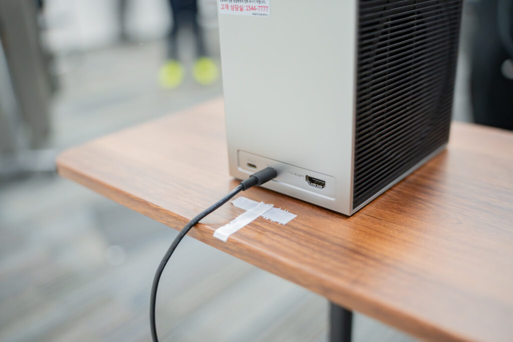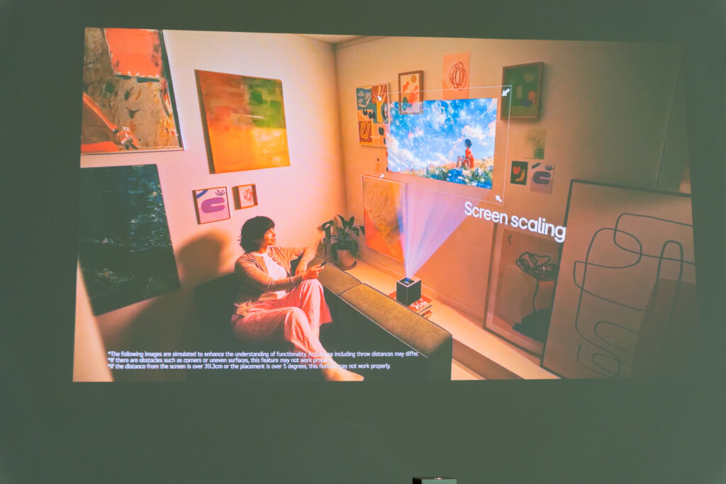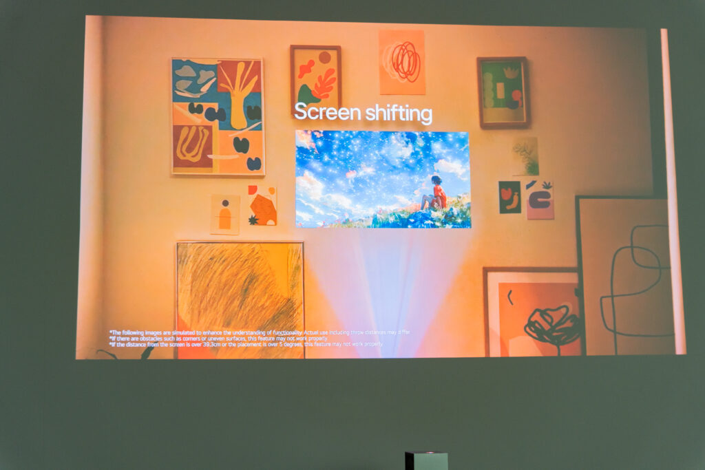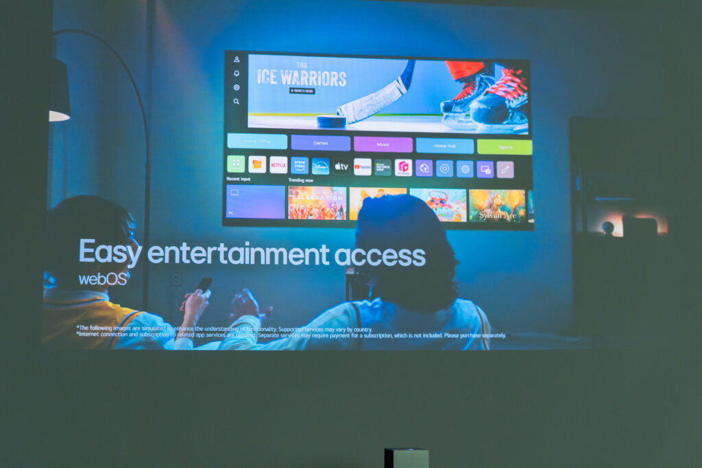 「LG CineBeam S」の最大の特徴は、その超短焦点投影能力だ。壁との距離わずか約8cmで40インチ、約40cmで100インチの大画面を投影できる。これにより、従来のプロジェクターでは必要だった広いスペースを確保する必要がなく、家具の配置を変えることなく大画面を楽しめる。