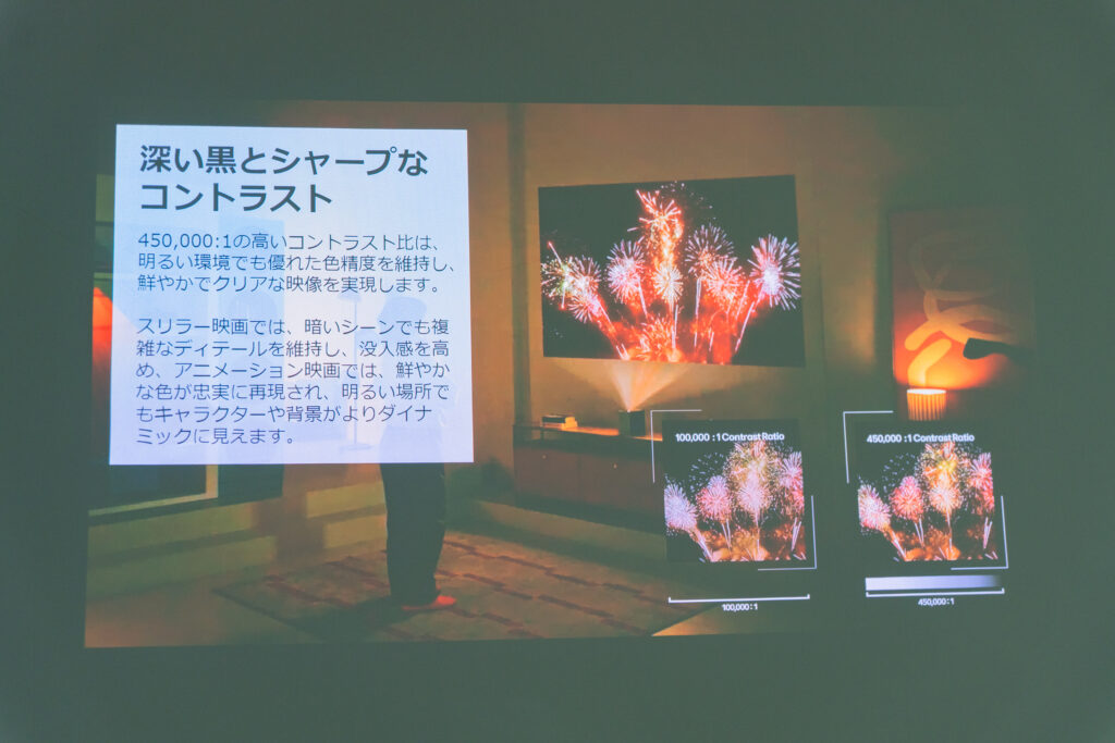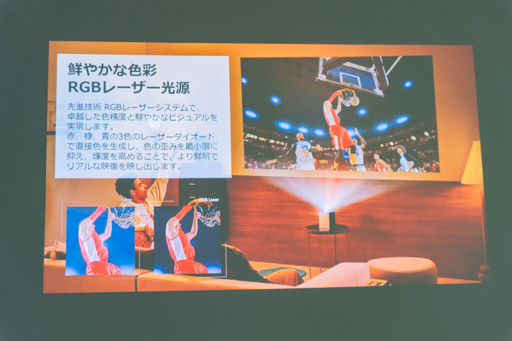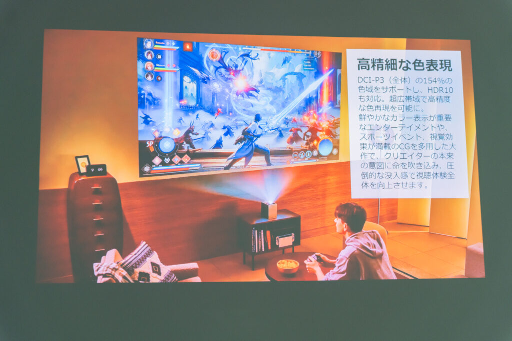 画質面では、3チャンネルRGBレーザーとDCI-P3 154%の広色域、HDR10対応により、鮮明なディテールとリアルな黒の再現を実現。またコントラスト比は450,000:1と高く、映像の明暗に左右されにくい鮮やかな発色が期待できるはずだ。ただし数少ない弱点として、最大輝度が500 ANSIルーメンなことには注意が必要。日中、日が差した部屋などで使うには流石に見づらいかもしれない。