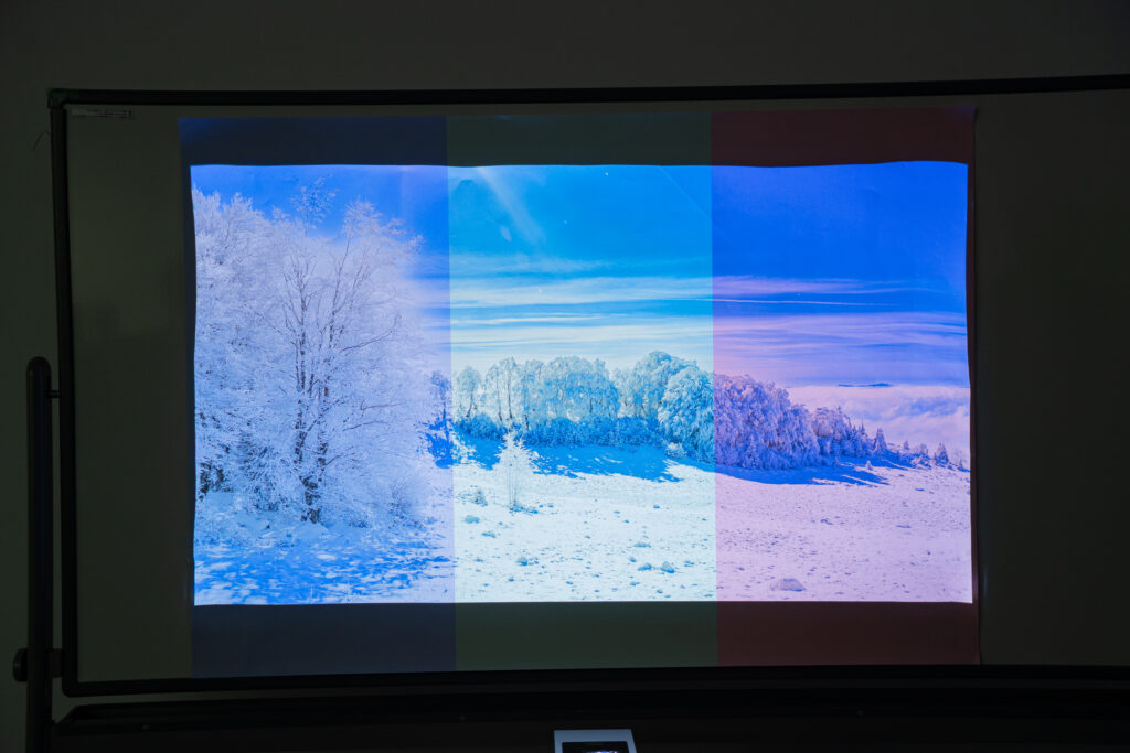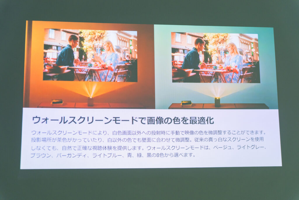 加えて、壁の色に合わせて映像の色味を調整する「ウォールスクリーンモード」も搭載しており、8色の中から壁色に合わせて最適化が可能。白い専用スクリーンがなくても自然な色で映像を楽しめる。