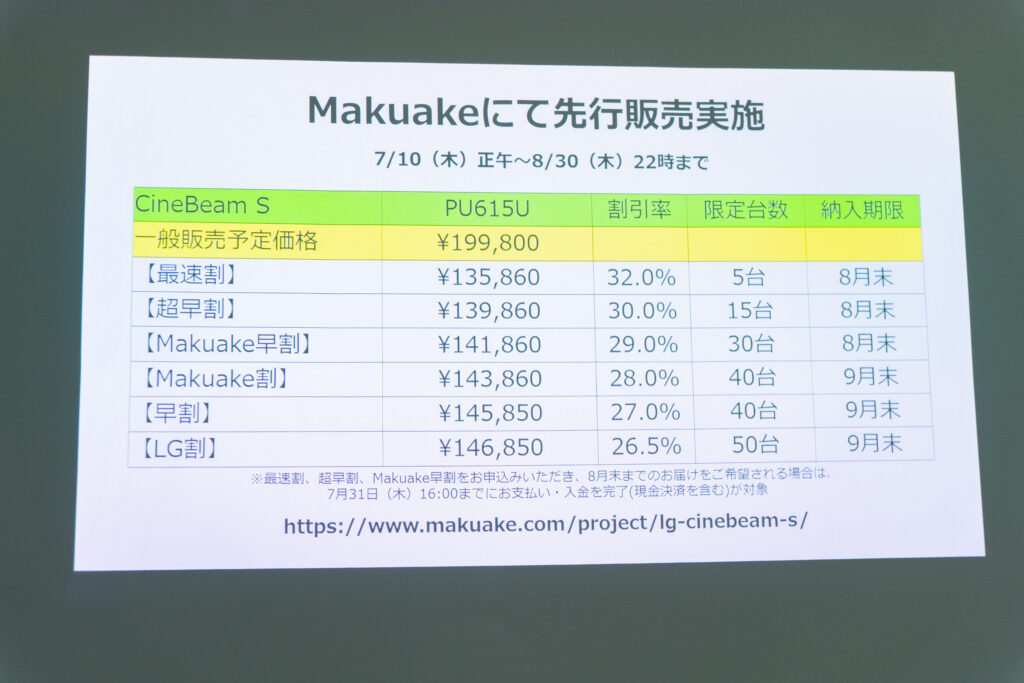 「LG CineBeam S」は、2025年7月10日(木)正午から8月30日(土)22時まで、クラウドファンディングサイト「Makuake」にて先行販売される。最速割プランでは最大32%オフ、なんと13万円台という衝撃の価格で購入できるチャンスもある。