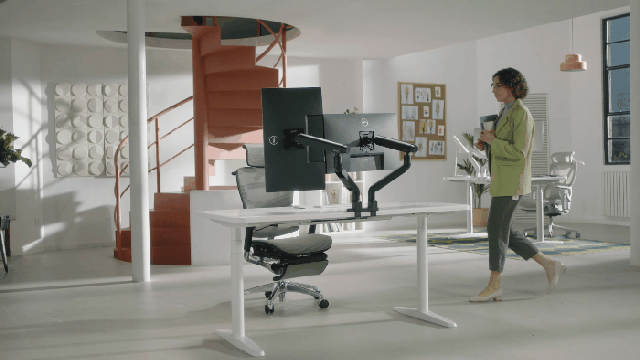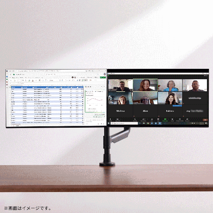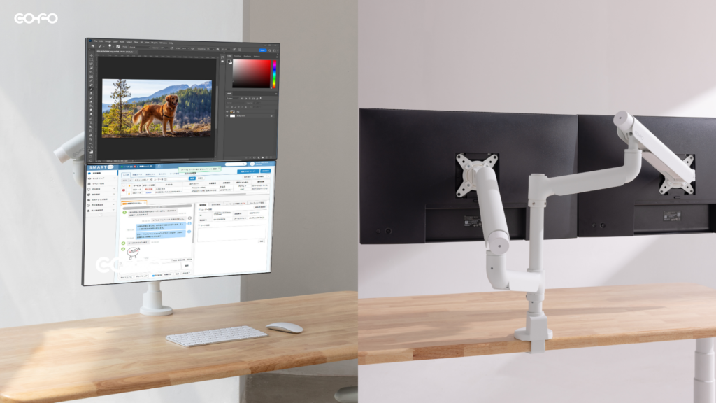 本製品は、モニターを上下にも左右にも配置できるデュアルアームを採用している。これにより、例えば上下配置では、上部モニターで資料やリファレンスを表示しながら下部モニターで作業するといった効率的な作業環境を構築できる。一方左右配置では、広い視野で作業を行いたいときなどに最適な環境にできそうだ。